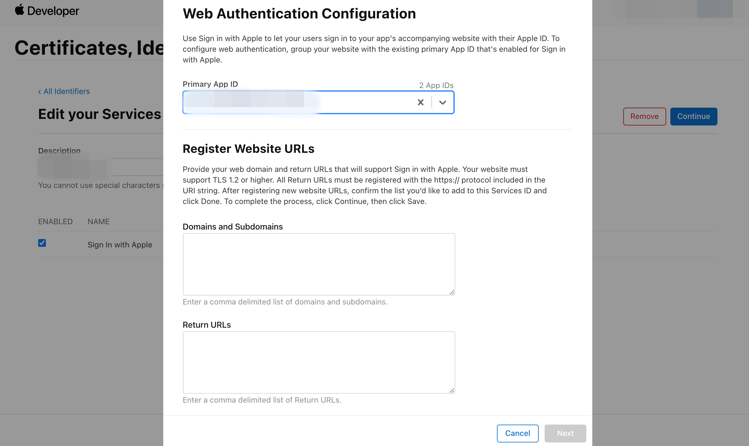 Service ID를 등록 한뒤 다시 수정하러 들어가서 Sign In with Apple 을 선택해준 뒤 Configure을 눌러주면