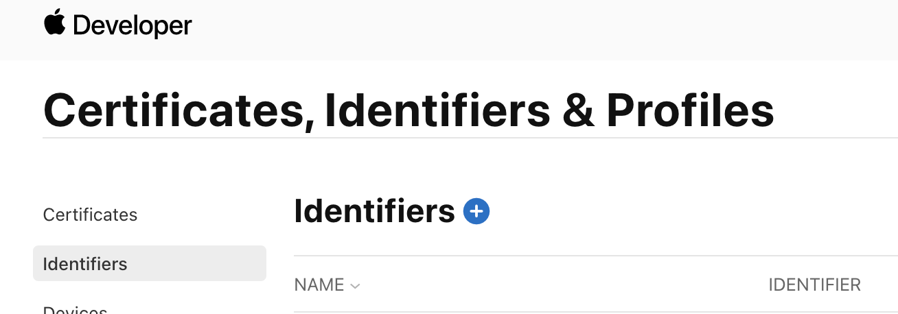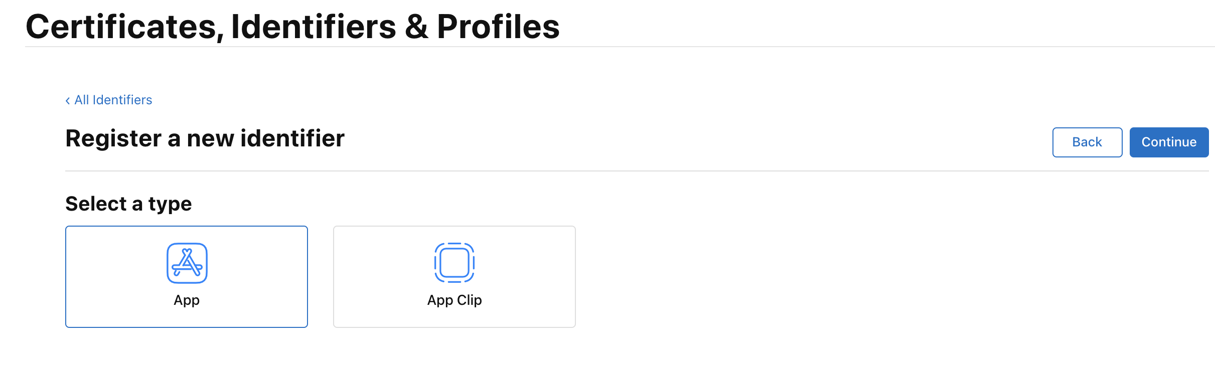 Identifiers > Identifiers + 버튼을 눌러준다. 그리고 App IDs 를 선택하고 다음.