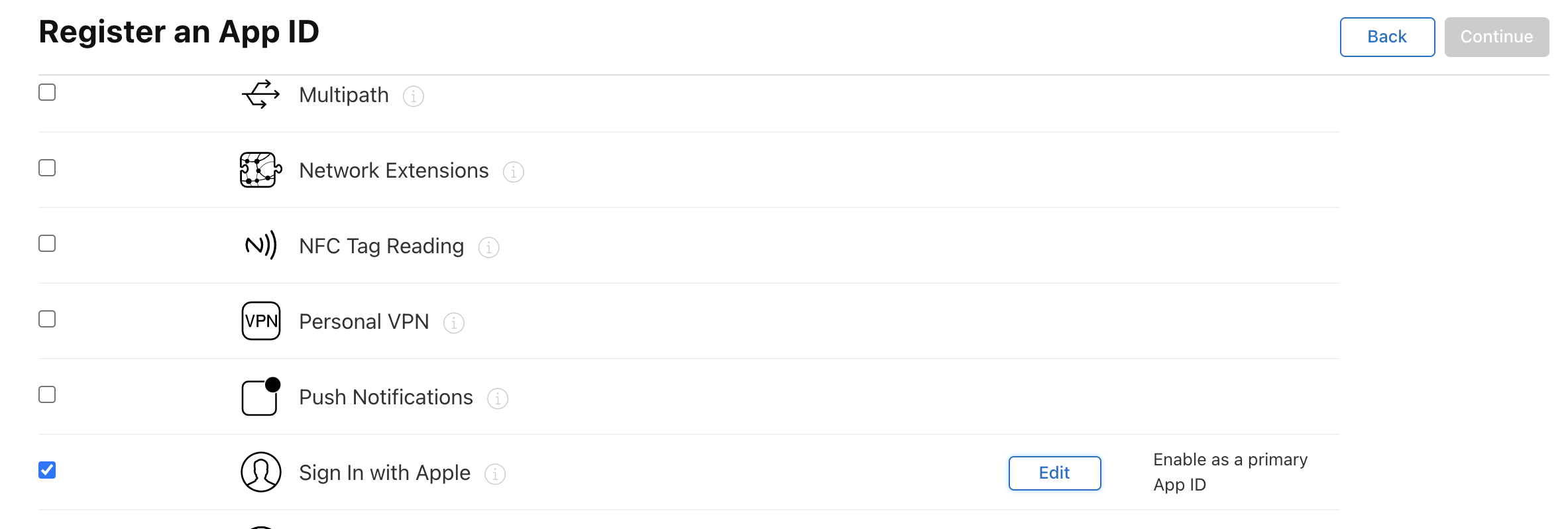 그리고 아래쪽에 Sign In with Apple을 선택해주게되면 Edit 버튼이 활성화 되는데