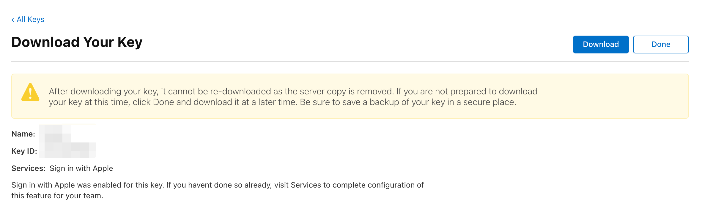 AuthKey_[KeyID].p8 라는 키파일이 다운로드 받아 질텐데 잘 보관해주자. 재다운이 불가능하니까 꼭 다운로드 받아주자.