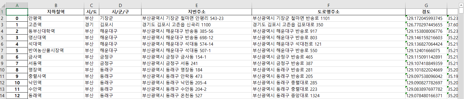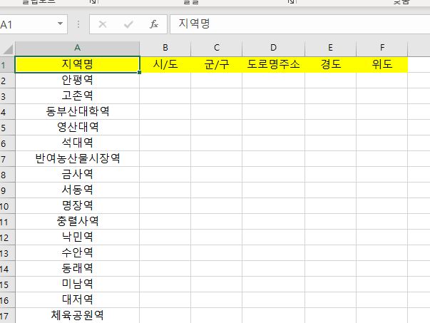 # 지하철역 주소 엑셀화