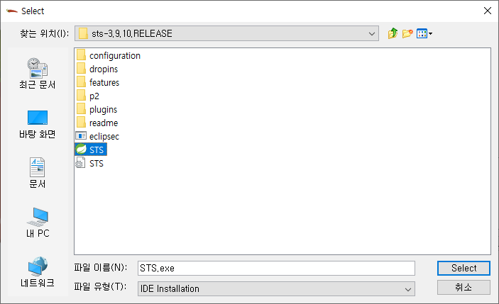 Specify location 버튼을 누른 뒤 자신의 STS or eclipse 실행파일을 찾아서 설정해준다.